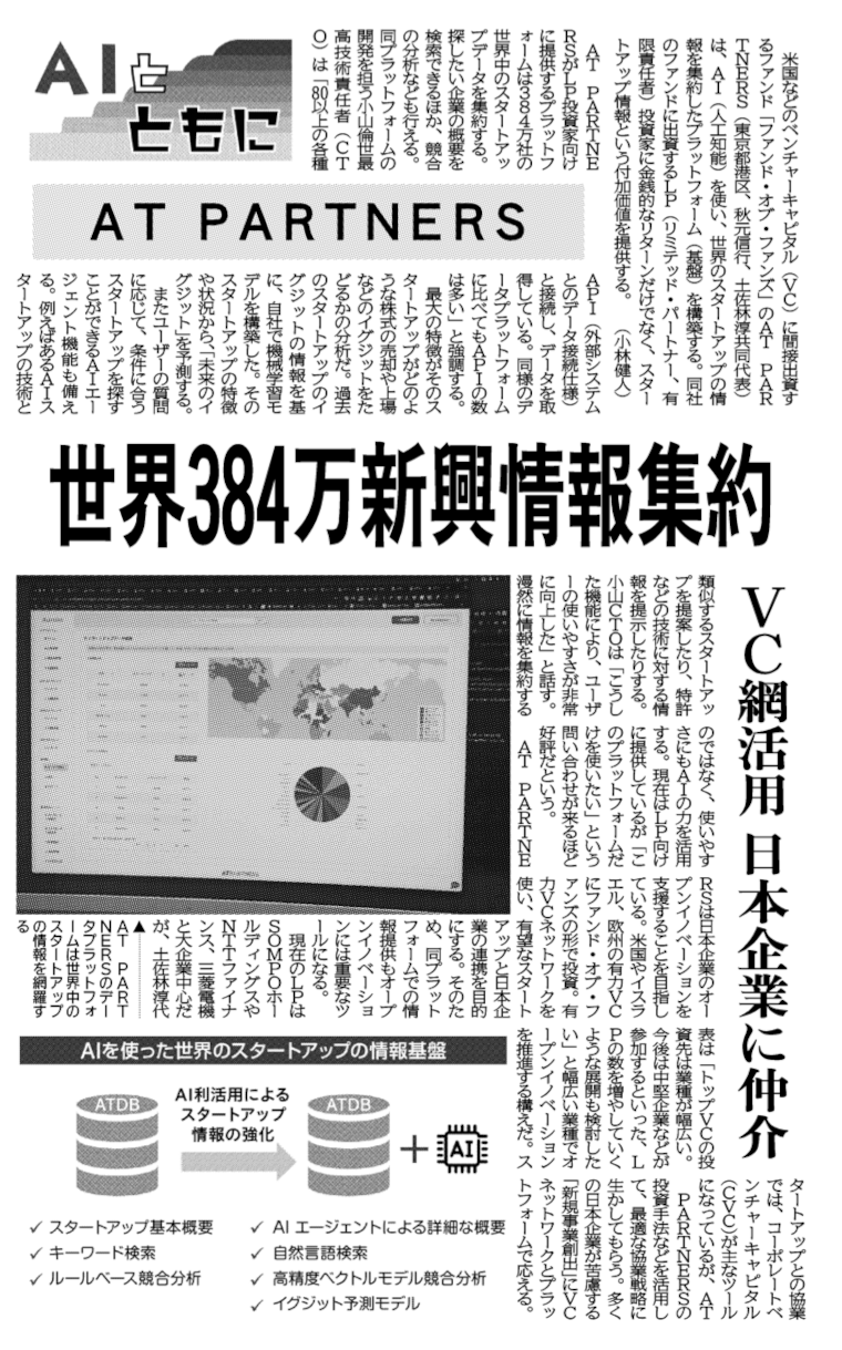 日刊工業新聞に弊社のスタートアップデータベース(ATDB)の記事が掲載されました